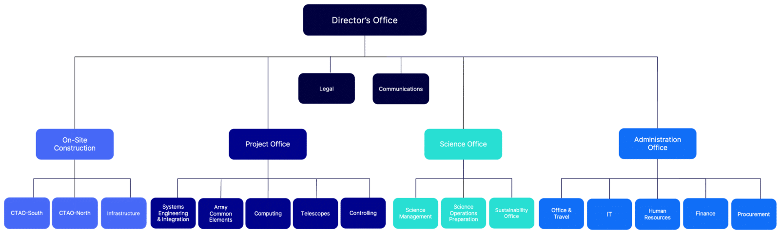 The CTAO Central Organisation (CTAO ERIC) manages its construction and operation of the Observatory. Thus, it is made up of the groups and people dedicated to the management and administration of the Observatory’s development and the overall project, science, computing and systems engineering activities. The high-level organisational structure is broken into five main groups:
